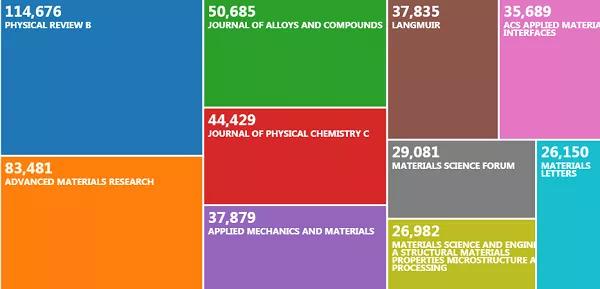 來源出版物方面,21世紀材料發(fā)文量排名前三的期刊是Physical Review B、Advanced Materials Research和Journal of Alloys and Compounds,其中Physical Review B發(fā)文量更是超過了10萬篇,其他我們耳熟能詳?shù)钠诳€包括ACS Applied Materials and Interfaces和Langmuir等。