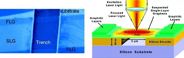 此文中,作者報道了借助共聚焦顯微拉曼光譜進行的懸浮單層石墨烯中導熱的首次實驗研究。根據(jù)拉曼G峰值頻率對激發(fā)激光功率的相對關系,作者計算出單層石墨烯的導熱系數(shù)室溫值高達5300 W/mK。極高的熱導率值表明,石墨烯在熱傳導方面可以勝過碳納米管(CNTs)。石墨烯的優(yōu)異導熱性能對于其可能的電子應用是有益的,并表明石墨烯可作為應用于熱管理的優(yōu)異材料。已發(fā)現(xiàn)的石墨烯出色的熱學性能說明石墨烯可作為光電,光子學和生物工程學中的熱管理材料,這拓寬了其應用范圍。