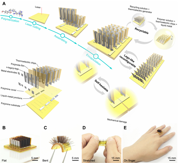 要點(diǎn):模塊化的熱電片(Thermoelectric chips)插入到新型動(dòng)態(tài)共價(jià)聚合物(Polyimine)基板上,通過(guò)液態(tài)金屬導(dǎo)線進(jìn)行模塊間的電連接。