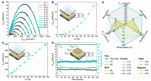 要點(diǎn):1、95K溫差下開(kāi)路電壓密度可達(dá)1V/cm2。熱端100℃下可以穩(wěn)定持續(xù)工作100小時(shí)。證明了在低溫廢熱(<100℃)回收應(yīng)用下的優(yōu)異的輸出性能和可靠性。2、在開(kāi)路電壓、輸出功率、柔性、拉伸性、自愈合和可循環(huán)等指標(biāo)下具有顯著的綜合優(yōu)勢(shì)。