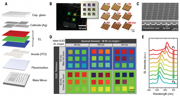 光學(xué)超表面開始進入集成設(shè)備,可以增強和控制光波的發(fā)射、調(diào)制、動態(tài)整形和檢測。在這項研究中,三星先進技術(shù)研究院&斯坦福大學(xué)發(fā)現(xiàn)有機發(fā)光二極管(OLED)顯示器的體系結(jié)構(gòu)可以通過引入納米圖案的超表面反射鏡而完全重新設(shè)想。 在最終的meta-OLED顯示器中,不同的metasurface圖案定義了紅色,綠色和藍色像素,并確保從有機白色發(fā)光體中優(yōu)化提取這些顏色。這種新的體系結(jié)構(gòu)有助于創(chuàng)建使用可縮放納米壓印光刻技術(shù)的新興顯示應(yīng)用(例如增強現(xiàn)實)所需的超高像素密度(每英寸> 10000像素)的設(shè)備。相對于標準的彩色濾光白色OLED,所制造的像素還具有兩倍的發(fā)光效率和出色的色純度。Metasurface-driven OLED displays beyond 10000 pixels per inch.(Science, 2020, DOI:10.1126/science.abc8530)2.三星先進技術(shù)研究院Nature:高效穩(wěn)定的藍色量子點發(fā)光二極管