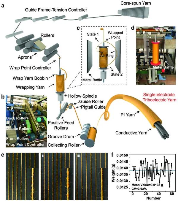 a)連續(xù)空心軸花式捻線機(jī)技術(shù)工藝示意圖。e)用黑板法表征FRTY紗線質(zhì)量的圖片。f)通過定量測試方法測定FRTY的重量,以表征紗線的細(xì)度和均勻性。