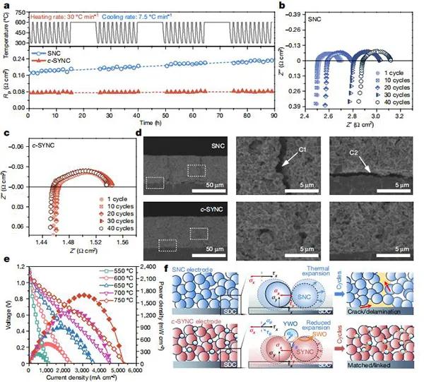 (a)基于SNC和c-SYNC的對(duì)稱電池電極在600℃到300℃之間的40個(gè)熱循環(huán)中的ASR(RP)響應(yīng)(在最低30℃ min-1的加熱速率和大約最低7.5℃ min-1的被動(dòng)冷卻下90小時(shí)的總累計(jì)試驗(yàn));(b,c)循環(huán)后SNC(b)和c-SYNC(c)對(duì)稱電池的代表性EIS曲線;(e)有40μm厚c-SYNC陰極的陽極支撐的H2/空氣SOFC的I-V和I-P(I,電流密度;V,電壓;P,功率密度)曲線;(f)提出了在c-SYNC復(fù)合電極TEC補(bǔ)償熱機(jī)械增強(qiáng)的機(jī)理,并對(duì)粒子相互作用和力的分析進(jìn)行了放大,對(duì)比了SNC與c-SYNC的行為。 文章轉(zhuǎn)載自微信公眾號(hào):材料人