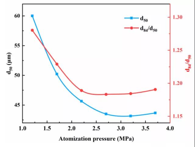 在實(shí)際生產(chǎn)過(guò)程中,霧化噴嘴結(jié)構(gòu)確定之后,可控制的變量一般包括金屬熔體的過(guò)熱度、霧化氣體壓力和溫度、霧化氣體的種類(lèi)等參數(shù)。在本文中,出于簡(jiǎn)化和貼近實(shí)際生產(chǎn)的原則,將液體流量和溫度固定,流量采用 60L/h,溫度采用20℃,氣體壓力通過(guò)減壓閥控制, 根據(jù)計(jì)算機(jī)模擬的結(jié)果,如圖 3 所示,在其他條件不變的情況下,僅改變霧化壓力的大小,在 1.7MPa、2.2MPa和 2.7MPa 三個(gè)不同的壓力下制得的粉末平均粒徑更小且粒徑分布較窄;故設(shè)置實(shí)驗(yàn)壓力為 1.7MPa、2.2MPa 和 2.7MPa。同時(shí), 在壓力為 2.2MPa 時(shí),添加一組液體流量為 120L/h 的實(shí)驗(yàn), 對(duì)比分析液體流量對(duì)霧化過(guò)程的影響。