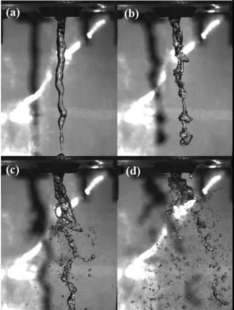 高速攝影拍攝的結(jié)果可保存為視頻文件,利用 Adobe Premiere Pro 軟件,可將視頻中每一幀圖像提取出來(lái),選擇其中典型的霧化圖像可以對(duì)霧化過(guò)程進(jìn)行分析。以氣體壓力為1.7MPa, 液體流量為 60L/h 為例, 提取出一系列圖片, 如圖 4所示。