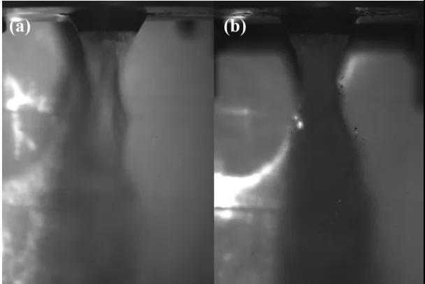 圖 7 不同液體流量時(shí)的霧化流場(chǎng)圖像:(a) Q=60L/h; (b)Q=120L/h