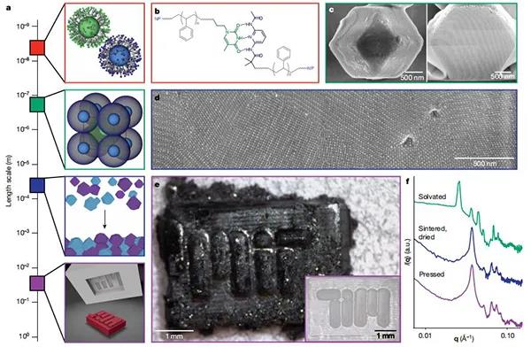 納米顆粒組裝已經被提出作為一種理想的方法來構建材料的層次組織,通過選擇納米尺度的組件來自下而上構建整個材料。多尺度結構控制是非??扇〉?,這是源于化學組成、納米尺度順序、微觀結構和宏觀形式都影響物理性質。然而,通常決定納米顆粒有序的化學相互作用,并不能提供任何在更大長度尺度上操縱結構的手段。微觀結構和宏觀形態(tài)仍然是未充分探索的設計參數,開發(fā)能夠將單個自組裝結構結合成宏觀的加工技術,將是開發(fā)在所有尺寸狀態(tài)下具有完全結構控制的納米顆粒的重要步驟。因此,基于納米顆粒的材料開發(fā)需要在不犧牲其自組裝納米級排列的情況下,定制微觀和宏觀結構的加工策略。其中,納米復合技術(NCT)非常適合生產此類分層材料,源于其固有的可伸縮成分組成,并使用動態(tài)結合相互作用來決定納米顆粒如何排列成有序陣列。每個NCT均由覆蓋有聚合物的無機納米顆粒組成,其中每個聚合物鏈均終止于超分子結合基團。將溶劑分散的NCT與互補結合基團混合后,超分子相互作用將顆粒組裝成更大的結構。由于將NCT連接在一起的超分子相互作用是動態(tài)的,因此通過其解離溫度冷卻一系列NCT,可使它們組織成有序的超晶格。然而,由于聚合物鏈在干燥過程中迅速收縮,之前試圖從組裝溶劑中去除晶格的嘗試導致了晶格的混亂。因此,從這些NCTs中形成獨立的宏觀固體,首先需要一些方法來穩(wěn)定它們,以防止在溶劑去除過程中的順序損失。今日,美國麻省理工學院 Robert J. Macfarlane教授課題組(通訊作者)提出通過逐漸引入與聚合物發(fā)生不利相互作用的非溶劑來穩(wěn)定晶格,以防止聚合物塌陷,與該非溶劑的相互作用將導致鏈采用較致密的構型并使晶格收縮。從而演示了快速組裝以克為單位的多面納米顆粒超晶格微晶的方法,利用此方法這些晶體可以類似于塊狀固體的燒結,進一步形成宏觀物體。該方法的關鍵是:控制納米顆粒組裝的化學相互作用在后續(xù)處理步驟中保持活性,這使得在形成宏觀材料時,可以保留顆粒的局部納米級有序性??梢愿鶕Ц裎⒕У某叽?,化學組成和晶體對稱性來調整固體的納米結構和微觀結構,微觀結構和宏觀結構可以通過后續(xù)的加工步驟進行控制。因此,這項工作提供了一種通用的方法,可以同時控制分子到宏觀長度尺度上的結構組織。相關研究成果以“Macroscopic materials assembled from nanoparticle superlattices”為題發(fā)表在Nature上。
