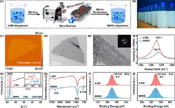 (a)微射流工藝過程及其(b)批量化制備展示。125 MPa壓力下制備的BNNS的(c) AFM、(d) TEM和(e) HR-TEM圖像。h-BN和BNNS(f)拉曼光譜、(g) XRD、(h) FTIR、高分辨率(i) B1s和(j) N1s XPS光譜的對比。