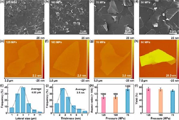 不同施加壓力下制備的BNNS的(a–d) SEM及(e–h) AFM圖像。(i) 75 MPa施加壓力下制備的BNNS的橫向尺寸和(j)厚度分布統(tǒng)計。(k) BNNS的縱橫比和及(l)產(chǎn)率與施加壓力之間的關(guān)系。