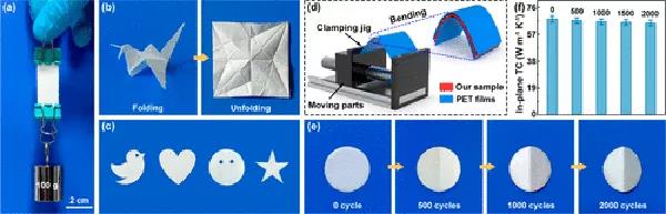 83 wt%含量下BNNS-1500/PVA復(fù)合薄膜具有(a)良好的機械強度和(b)高度可折疊性,(c)易于裁切成型。(d)循環(huán)彎曲試驗及其相應(yīng)的(e)形貌和(f)面內(nèi)導(dǎo)熱率變化。