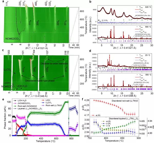 圖2 a 碳酸鹽前驅(qū)體Ni0.6Co0.2Mn0.2CO3的變溫同步輻射衍射圖及b 加熱至320 °C和900 °C時(shí)的Rietveld精修圖;c Ni0.6Co0.2Mn0.2CO3和LiOH·H2O的變溫同步輻射衍射圖及d 在室溫25 °C和加熱至550 °C時(shí)的Rietveld精修圖;e 混合物加熱過(guò)程中物相組成變化圖;f 無(wú)序巖鹽結(jié)構(gòu)(Fmm)和有序?qū)訝罱Y(jié)構(gòu)(Rm)加熱過(guò)程中的晶胞參數(shù)變化曲線。
