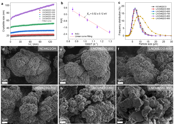 圖5高溫晶體生長(zhǎng)動(dòng)力學(xué)研究:a 晶粒尺寸在不同溫度下隨燒結(jié)時(shí)間的變化;b 晶粒生長(zhǎng)動(dòng)力學(xué)活化能計(jì)算圖;前驅(qū)體及不同溫度煅燒下c 粒徑分布圖和d-i 掃描電子顯微鏡圖。