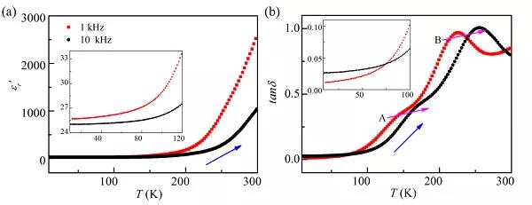 圖3 CaCu3Fe2Ta2O12在1 kHz和10 kHz時(a) 介電常數(shù)和(b) 介電損耗的溫度依賴性。