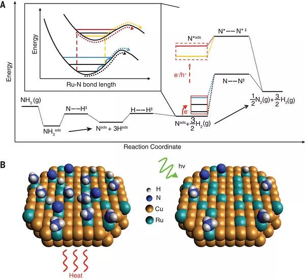 在以等離子體金屬納米顆粒為代表的催化劑發(fā)揮光熱催化效果時,產(chǎn)生熱電荷載流子可活化反應(yīng)物、并降低反應(yīng)的總能壘。然而,在這過程中的熱和電子激發(fā)的關(guān)系尚不清楚。針對這一問題,萊斯大學(xué)的Peter Nordlander和Naomi J. Halas[3]等人通過研究氨氣分解來分析光和熱激發(fā)的作用。在銅合金納米構(gòu)造中,通過吸收光產(chǎn)生電子可活化在釕表面原子上的氮原子。通過測量不同波長、光強和催化劑表面溫度下的反應(yīng)速率,可以定量表觀活化能壘,厘清熱載流子的作用,并為設(shè)計高效光催化劑奠定了基礎(chǔ)。