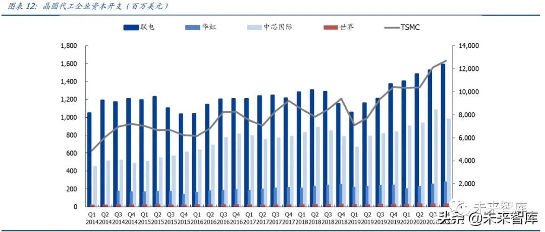 Capex 進(jìn)入上行期,臺積電、中芯國際紛紛增加資本開支。臺積電從 2020 年 170 億美 金增長到 300 億美金(用于 N3/N5/N7 的資本開支占 80%),再到 2021 年 4 月 1 日公 布的未來三年資本開支 1000 億美金;聯(lián)電從 2020 年 10 億美金增長到 23 億美金(用 于的 12 寸晶圓的資本支出占 85%);華虹從 2020 年 11 億美金增長到 2021 年 13.5 億 美金(大部分用于華虹無錫 12 寸);中芯國際 2021 年資本維持高位,達(dá)到 43 億美金 (大部分用于擴(kuò)成熟制程,尤其是 8 寸數(shù)量擴(kuò) 4.5 萬片/月),開啟新一輪資本開支。
