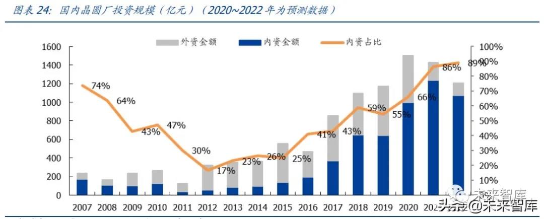 國內(nèi)晶圓廠投資金額即將進(jìn)入高峰期。根據(jù)統(tǒng)計,2020~2022 年國內(nèi)晶圓廠總投資金 額約 1500/1400/1200 億元,其中內(nèi)資晶圓廠投資金額約 1000/1200/1100 億元。2020~2022 年國內(nèi)晶圓廠投資額將是歷史上最高的三年,且未來還有新增項目的可能。