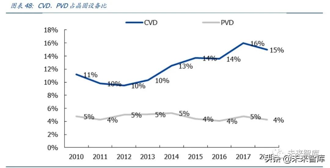 薄膜設(shè)備中,CVD 使用越來越廣泛。2018 年晶圓設(shè)備市場,沉積設(shè)備占比為 22%, CVD 占 15%,PVD 占 4%,其他還有 ECD、MOCVD、SOD、外延等。