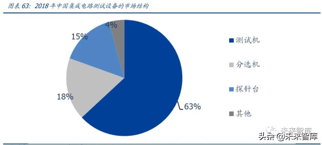 隨著國內(nèi)封測廠陸續(xù)投入新產(chǎn)線,產(chǎn)能實現(xiàn)擴(kuò)張,將持續(xù)帶動國內(nèi)半導(dǎo)體測試設(shè)備市場 高速增長。根據(jù) SEMI,2018 年國內(nèi)集成電路測試設(shè)備市場規(guī)模約 57.0 億元,集成電路 測試機(jī)、分選機(jī)和探針臺分別占比 63.1%、17.4%和 15.2%,其它設(shè)備占 4.3%。