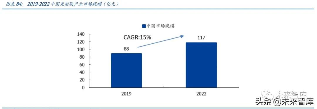 Cision 同時也統(tǒng)計了中國光刻膠市場的規(guī)模,在 2019 年約為 88 億元人民幣,至 2022 年預(yù)計將達(dá)到 117 億元人民幣,實現(xiàn)復(fù)合增長 15%。如若我們根據(jù)全球光刻膠的應(yīng)用 場景分布來看,在中國大陸所需要的半導(dǎo)體、LCD、及PCB的市場需求分別將達(dá)到21、 23、22 億元人民幣。