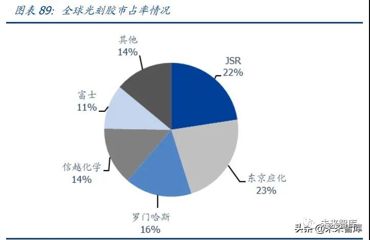 整體來看,全球光刻膠行業(yè)主要被 JSR、東京應(yīng)化、羅門哈斯、信越化學(xué)、及富士合理 占據(jù),前五大家占據(jù)了全球光刻膠領(lǐng)域的 86%;如若聚焦到全球半導(dǎo)體用光刻膠領(lǐng)域, 前六大家(主要以日本為主)實現(xiàn)了對于市場的 87%的占據(jù)。