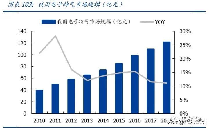 根據(jù) SEMI 預(yù)計,至 2020 年電子特氣的市場規(guī)模將達(dá)到 43.7 億美元。2010-2018 年, 我國電子特氣市場規(guī)模復(fù)合增速達(dá) 15.3%,2018 年我國電子特氣市場規(guī)模達(dá) 121.56 億 元。其中,半導(dǎo)體制造用電子特氣市場規(guī)模約 45 億元。根據(jù)前瞻產(chǎn)業(yè)研究院預(yù)測, 2024 年我國電子特種氣體市場規(guī)模將達(dá)到 230 億元。