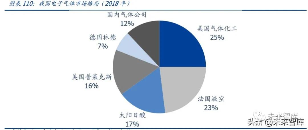然而,目前我國電子特氣進(jìn)口依賴度高,進(jìn)口替代潛力較大。隨著我國半導(dǎo)體、顯示面 板市場的快速擴(kuò)張,包括電子特氣在內(nèi)的上游原材料實現(xiàn)進(jìn)口替代意義重大。目前我國 電子特種氣體市場呈寡頭壟斷格局,2018 年外企占我國電子氣體市場 88%份額。我國 電子氣體領(lǐng)域目前的主要的外企包括美國空氣化工集團(tuán)、法國液化空氣集團(tuán)、日本太陽 日酸株式會社、美國普萊克斯、德國林德集團(tuán)。國內(nèi)主要企業(yè)包括中船 718 所、昊華黎 明院等。目前我國電子特氣企業(yè)產(chǎn)品供應(yīng)仍較為單一,但在政策扶持及下游需求的拉動 下,我國電子特氣企業(yè)體量、產(chǎn)品品種迅速發(fā)展,該領(lǐng)域進(jìn)口替代已拉開序幕。