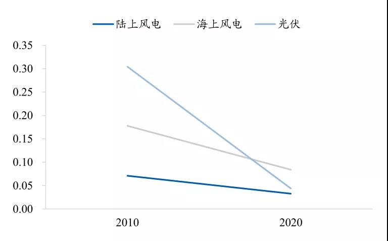 根據(jù)IRENA的統(tǒng)計(jì),過去十年間中國(guó)陸上/海上風(fēng)電的平均度電成本分別由2010年的0.071/0.178美元降至2020年的0.033/0.084美元,下降幅度為54%/53%,明顯低于同期國(guó)內(nèi)光伏度電成本的下降幅度86%。