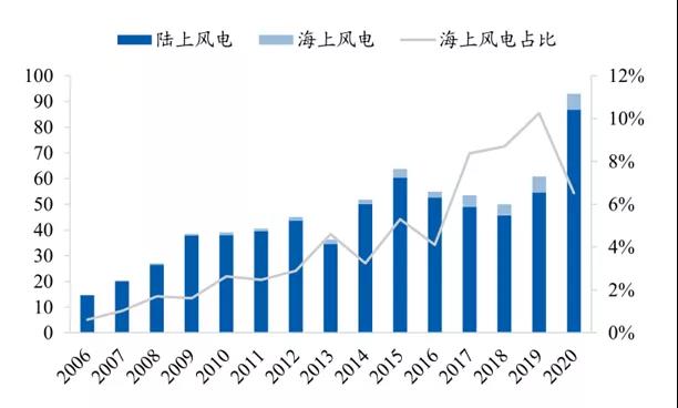 事實(shí)上,從全球范圍來看,現(xiàn)階段海上風(fēng)電整體處于發(fā)展初級(jí)階段。根據(jù)全球風(fēng)能理事會(huì)的統(tǒng)計(jì),截至2020年全球海上風(fēng)電累計(jì)裝機(jī)規(guī)模為35GW,在總裝機(jī)中的占比僅為6%。