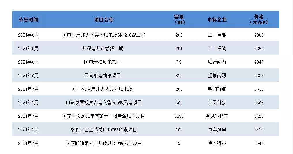 隨著風(fēng)機(jī)大型化的發(fā)展,降本增效已經(jīng)體現(xiàn)在了今年的風(fēng)機(jī)招標(biāo)價(jià)格上,根據(jù)今年風(fēng)電項(xiàng)目中標(biāo)情況,三北、西南地區(qū)大型風(fēng)電項(xiàng)目的風(fēng)機(jī)中標(biāo)價(jià)格已低至2300-2500元/kW,較2020年同期的價(jià)格大幅度下降。