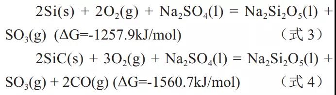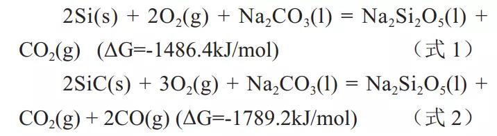 圖 2 為在 900℃ Na2CO3 和 Na2SO4 熔鹽中處理 4 h 的 SiC 陶瓷的 XRD 圖譜??梢钥闯?, 兩種熔鹽腐蝕后, SiC 陶瓷的相組成是相同的, 主要是由 SiC 和 Si 以及少量 Na2Si2O5 組成。其中,Na2SO4 熔鹽腐蝕樣品的硅含量明顯多于 Na2CO3熔鹽腐蝕樣品的硅含量。SiC 陶瓷中的 Si 相主要來源于其制備過程中填充到孔隙的游離硅 。熔鹽腐蝕過程中, 可能發(fā)生的化學反應(yīng)包括: