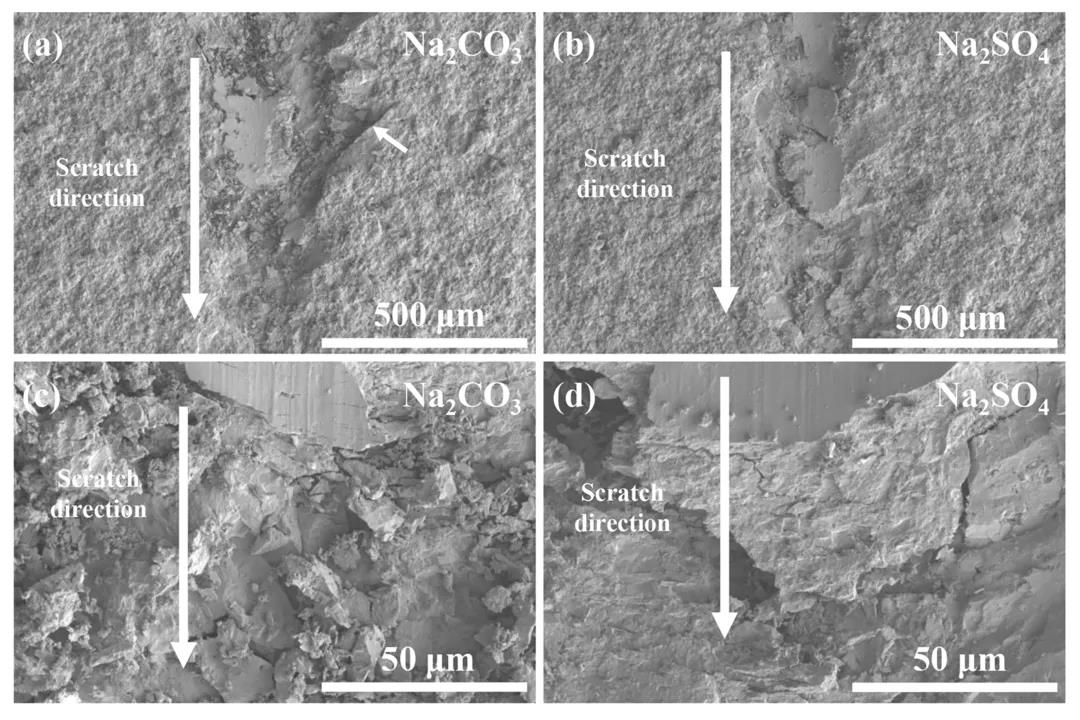 為了進一步驗證涂層 - 基體間的界面結(jié)合性能, 考察涂層 - 基體界面的劃痕性能、 壓痕性能和拉伸結(jié)合性能。圖 4 為在 900℃ 熔鹽中處理 4h 的 SiC 陶瓷表面制備的 Si 涂層的劃痕形貌。進行劃痕實驗前, 用細砂紙把涂層磨薄至 20~50μm,以觀察界面結(jié)合性。從低倍形貌( 圖 4(a)和 4(b))可以看出,Na2CO3 熔鹽處理的 Si 涂層劃痕形貌較深, 并且劃痕處涂層剝落現(xiàn)象明顯;而 Na2SO4 熔鹽腐蝕試樣的劃痕深度較淺,未見劃痕處有明顯的涂層剝落現(xiàn)象。從高倍形貌(圖4(c) 和4(d))可以看出, Na2CO3 熔鹽腐蝕試樣的涂層碎裂現(xiàn)象明顯,在劃痕處存在大量的碎屑,而 Na2SO4 熔鹽腐蝕試樣的內(nèi)部顆粒呈現(xiàn)階梯狀碎裂, 且未發(fā)現(xiàn)明顯的碎屑分布在劃痕處。