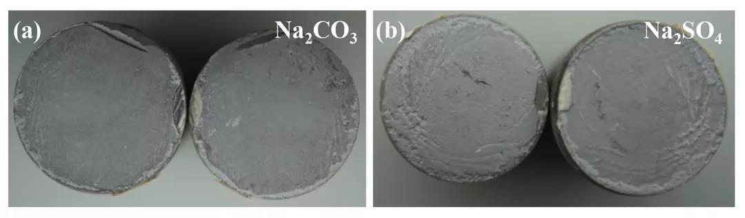 圖 6 SiC 陶瓷表面涂層 - 基體斷裂宏觀形貌:(a) Na2CO3 熔鹽 900℃處理 4 h;(b) Na2SO4 熔鹽 900℃處理 4 h