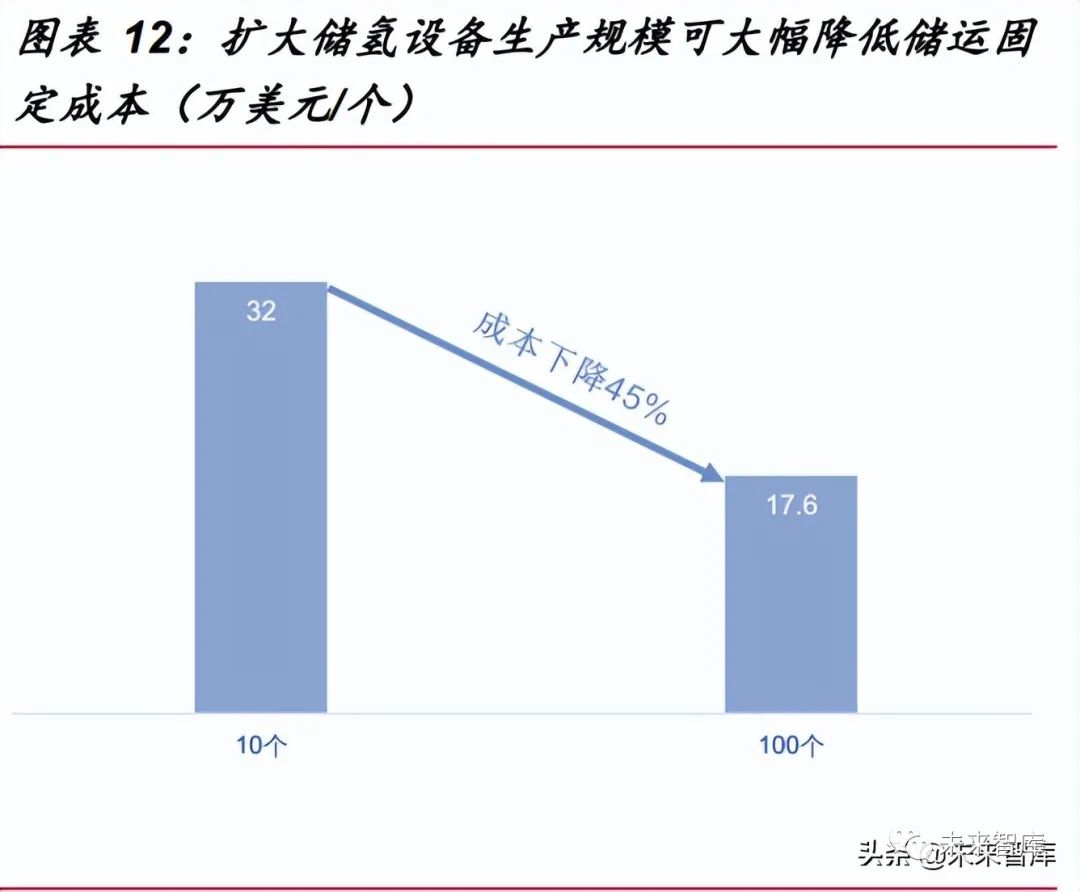 未來(lái)長(zhǎng)管拖氫儲(chǔ)運(yùn)成本下降的有效路徑是:一方面可通過(guò)提高儲(chǔ)氫壓力,實(shí)現(xiàn)儲(chǔ) 氫密度和運(yùn)輸效率都更高的氫氣儲(chǔ)運(yùn)方式;另一方面,未來(lái)氫氣氣態(tài)儲(chǔ)運(yùn)成本下降的 有效路徑是擴(kuò)大相關(guān)設(shè)備生產(chǎn)量。單位成本將在規(guī)模效應(yīng)下逐步下降。據(jù) NREL (National Renewable Energy Laboratory)預(yù)測(cè),當(dāng)儲(chǔ)氫容器需求量從 10 增加到 100 個(gè)時(shí),儲(chǔ)氫容器成本可下降約 45%。
