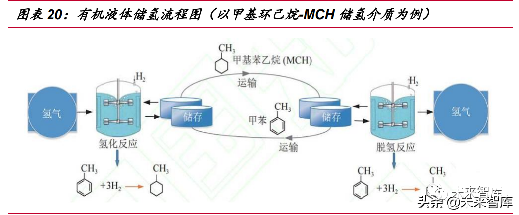 有機(jī)液體儲(chǔ)氫優(yōu)勢(shì)在于:加氫后的有機(jī)氫化物性能穩(wěn)定,安全性高,可常溫常壓 儲(chǔ)存,儲(chǔ)存方式與石油相似,質(zhì)量?jī)?chǔ)氫密度高,可達(dá) 5.0-7.2%/wt。其劣勢(shì)在于:氫 氣純度不高,有幾率發(fā)生副反應(yīng),產(chǎn)生雜質(zhì)氣體;反應(yīng)溫度較高、脫氫效率較低、催 化 劑易被中間產(chǎn)物毒化;液氫儲(chǔ)存壓縮能耗過(guò)大,需配備相應(yīng)的加氫、脫氫設(shè)備。 未來(lái)的技術(shù)突破方向是:提高低溫下有機(jī)液體儲(chǔ)氫介質(zhì)的脫氫速率與效率、催化 劑 反應(yīng)性能,改善反應(yīng)條件、降低脫氫成本及操作難度。