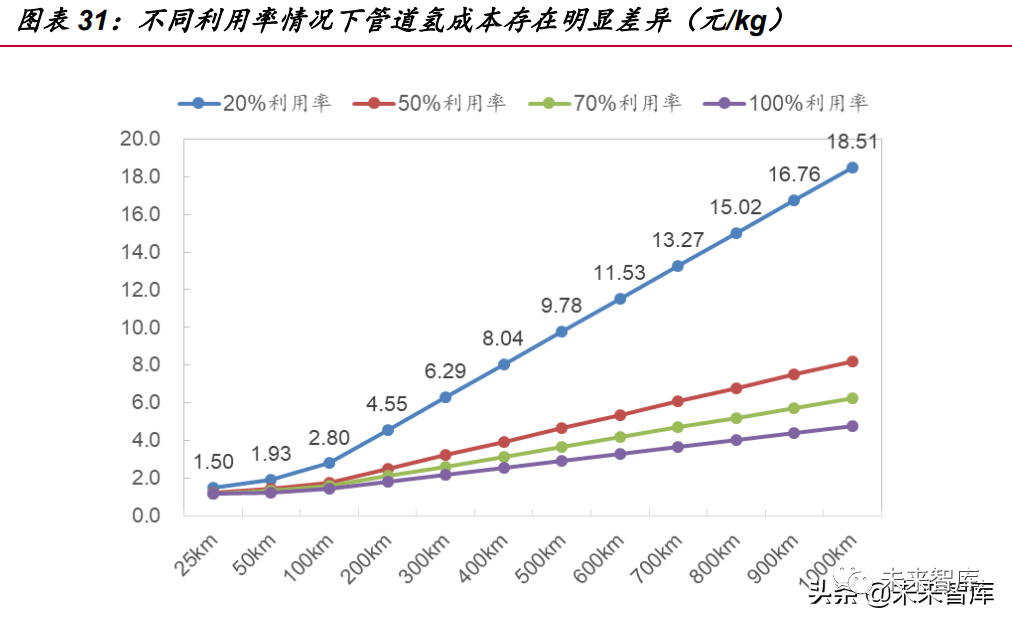 管道氫成本很大程度上受到需求端(利用率)的影響。在上述管道氫成本預(yù)測(cè) 中,我們假設(shè)管道運(yùn)能的利用率達(dá)到 100%,在這種水平下,管道氫運(yùn)輸成本表現(xiàn)出 非常低的水平,但隨著利用率水平的下降,管道氫成本陡然上升,當(dāng)運(yùn)能利用率僅為 20%時(shí),管道運(yùn)氫的成本已經(jīng)接近長(zhǎng)管拖車運(yùn)氫。在當(dāng)前加氫站尚未普及、站點(diǎn)較為 分散的情況下,管道運(yùn)氫的成本優(yōu)勢(shì)并不明顯。隨著氫能產(chǎn)業(yè)逐步發(fā)展,氫氣管網(wǎng)終 將成為低成本運(yùn)氫方式的最佳選擇。