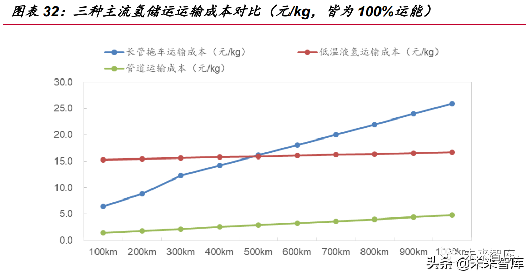 隨著大規(guī)模、長(zhǎng)距離運(yùn)氫需求的增加,低溫液氫輸送的優(yōu)勢(shì)將會(huì)顯現(xiàn),并成為中長(zhǎng) 運(yùn)距氫儲(chǔ)運(yùn)的主流方式。從氫能發(fā)展更遠(yuǎn)期來(lái)看,氫能產(chǎn)業(yè)發(fā)展將趨于成熟,用氫 需求將實(shí)現(xiàn)大規(guī)模化,且趨于穩(wěn)定,屆時(shí)管道輸氫綜合優(yōu)勢(shì)將成為長(zhǎng)距離氫運(yùn)輸最 佳選擇。