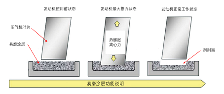 易磨涂層(Abradable Coating),是發(fā)動機(jī)葉尖封嚴(yán)系統(tǒng)的一部分,也叫“封嚴(yán)涂層”。通常應(yīng)用于機(jī)匣零件中的跑道面,主要作用是減少葉尖碰磨損傷。由于易磨涂層需要跟葉尖進(jìn)行對磨,為了保護(hù)葉尖,易磨涂層一般硬度小,結(jié)合力差,從而能夠保證葉尖在大服役狀態(tài)碰上時(shí),能夠有效地刮削涂層。