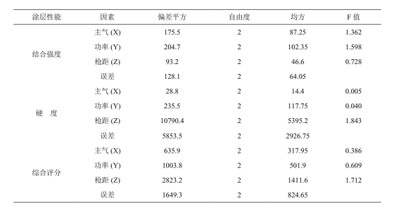 影響涂層質(zhì)量的力學(xué)性能指標(biāo)主要包括結(jié)合強(qiáng)度和顯微硬度。表 5 為不同工藝 C276-Ni60 涂層的結(jié)合強(qiáng)度和顯微硬度,采用極差法來(lái)分析,涂層的力學(xué)性能通過(guò)計(jì)算綜合加權(quán)評(píng)分的方法來(lái)評(píng)價(jià)。根據(jù)極差的大小,可以判斷出各個(gè)因素對(duì)涂層力學(xué)性能影響的主次順序,極差越大,則說(shuō)明該因素對(duì)性能的影響越大。另根據(jù)方差法可以定量分析各個(gè)因素對(duì)涂層質(zhì)量的影響程度,彌補(bǔ)直觀分析的不足,并通過(guò) F 值來(lái)檢驗(yàn)。