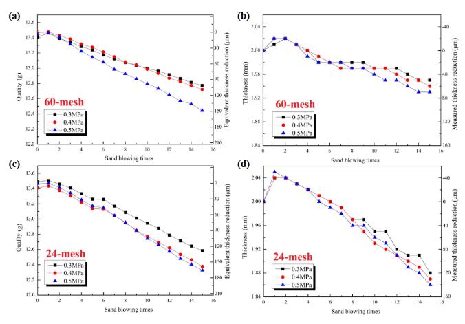 (2) 鋁合金薄壁件多次噴砂后質(zhì)量和厚度線性降低, 影響降低速率的主要因素也是砂粒粒度,噴砂壓力為次要因素。60 目砂多次噴砂使表面粗化層的厚度增大, 24 目砂多次噴砂則會減薄表面粗化層。