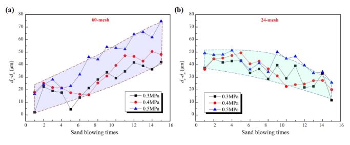 式中, mn, m0, ρ, A 分別代表第 n 次噴砂后的試樣質(zhì)量, 試樣噴砂前的質(zhì)量, 6061 鋁合金的密度, 試板的面積。本研究中 ρ=2750 kg·m-3, A=0.25mm2?;w的實際減厚 (dn) 由基體原始厚度減去 n次噴砂后的試樣厚度得出。可以發(fā)現(xiàn), 從第 1 次噴砂起, 基體實際減厚和當(dāng)量減厚均隨著噴砂次數(shù)的增加線性增加。計算了二者的差值 (de-dn),結(jié)果如圖 6 所示。de-dn 反映了噴砂過程中基體表面噴砂區(qū)的后退情況,若 de-dn 變化不大, 則噴砂過程中已噴砂粗糙層不斷后退,噴砂區(qū)以下部分被不斷噴砂, 結(jié)果來看噴砂區(qū)厚度( 可視為最高點與最低點的高度差) 保持不變, 表面狀態(tài)變化不大;若 de-dn 逐漸降低, 則噴砂過程中已噴砂粗糙層后退量較大,噴砂區(qū)以下部分被再次噴砂的厚度相對較小,結(jié)果來看噴砂區(qū)厚度逐漸減薄,粗糙度會有所降低;反之亦然。有趣的是,鋁合金基板在 60 目砂多次噴砂后,de-dn 逐漸增大,表明其表面粗化程度在不斷增加。而 24 目砂多次噴砂后, de-dn 小幅度降低,15 次噴砂后減小約 25μm, 說明其表面粗化程度略微減弱。