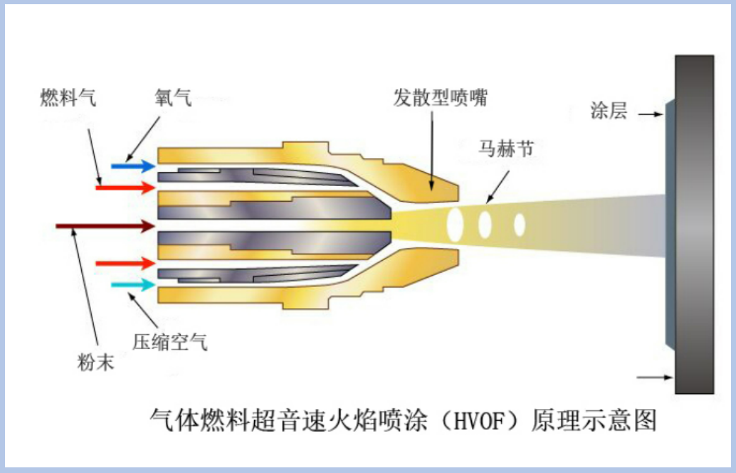 超音速火焰噴涂:以氧氣和燃料連續(xù)燃燒產(chǎn)生的熱量作為熱源,焰流速度超過聲音速度的熱噴涂方法,又稱高速火焰噴涂。超音速噴涂主要是依靠大幅度提高噴涂顆粒的速度來獲得高質(zhì)量的涂層,即:高的燃燒室壓力→高的燃流速度→高的顆粒飛行速度→高的涂層質(zhì)量。涂層性能與氣流的速度和溫度有關(guān),但目前研究結(jié)論趨向于認(rèn)為“粒子的速度或動能對涂層質(zhì)量的貢獻(xiàn)更大”。由動量定理可知,粒子速度越高,動量越大,沉積時(shí)的沖量越大;粒子速度越高,粒子對基體的撞擊作用越強(qiáng),粒子變形越充分,使涂層中顆粒之間的連接更加緊密,從而減小了涂層孔隙率,增大了涂層的結(jié)合強(qiáng)度。