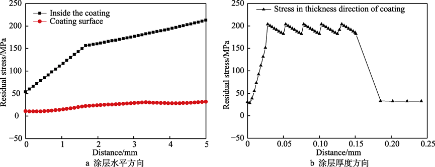 1)計(jì)算機(jī)模擬單層通道等離子噴涂ZrO2涂層,冷卻后其內(nèi)部的殘余應(yīng)力主要集中在熱流中心區(qū)域,涂層內(nèi)部最大的內(nèi)應(yīng)力為徑向拉應(yīng)力,涂層的等效應(yīng)力為160~220 MPa的殘余拉應(yīng)力。