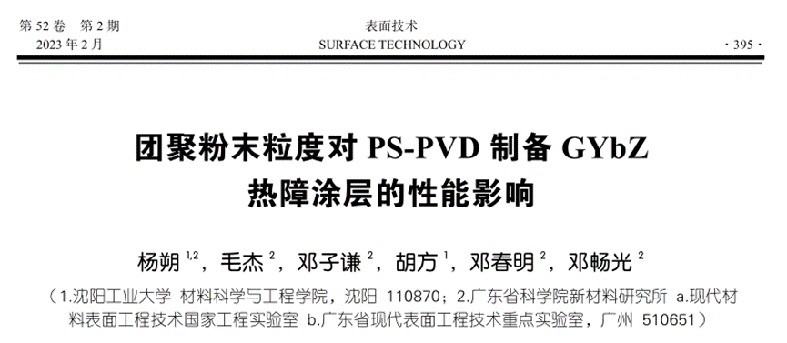YANG Shuo, MAO Jie, DENG Zi-qian, et al. Effects of Agglomerated Powder Particle Size on Performance of GYbZ Thermal Barrier Coating Prepared by PS-PVD[J]. Surface Technology, 2023, 52(2): 395-403.